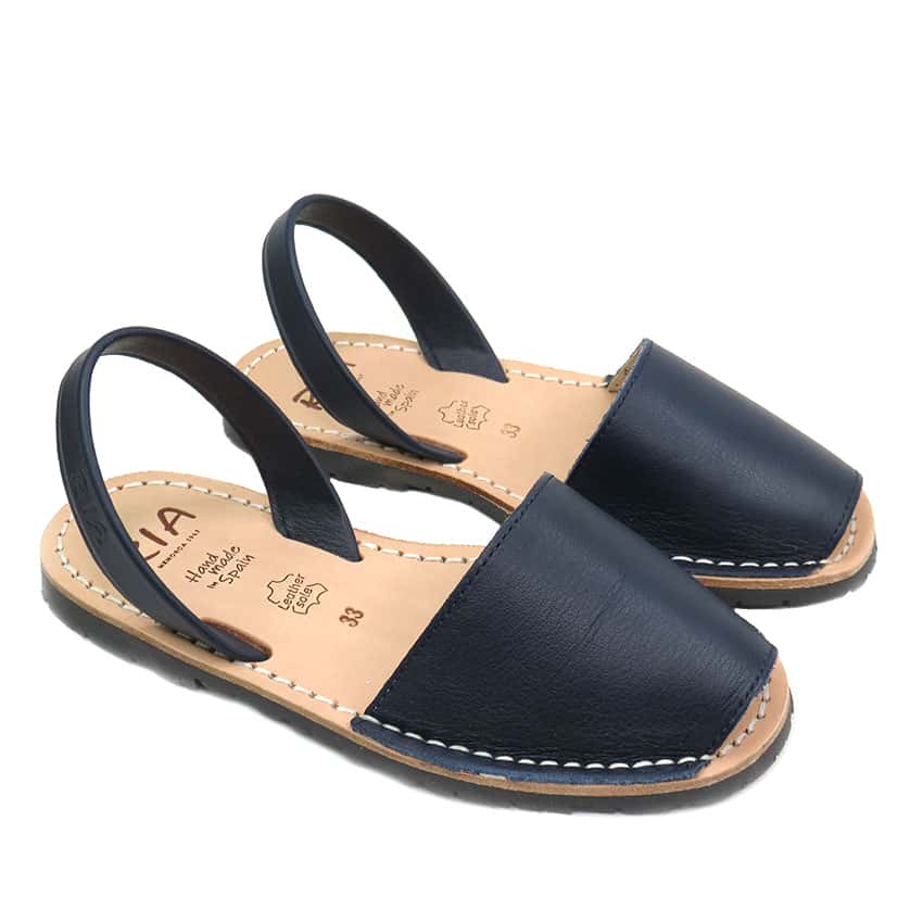 La auténtica avarca-menorquina de Ria super flexible y combinable diseñada en piel azul marino.