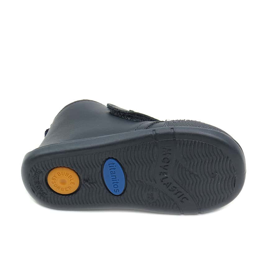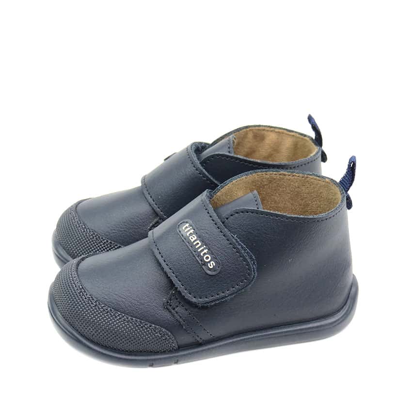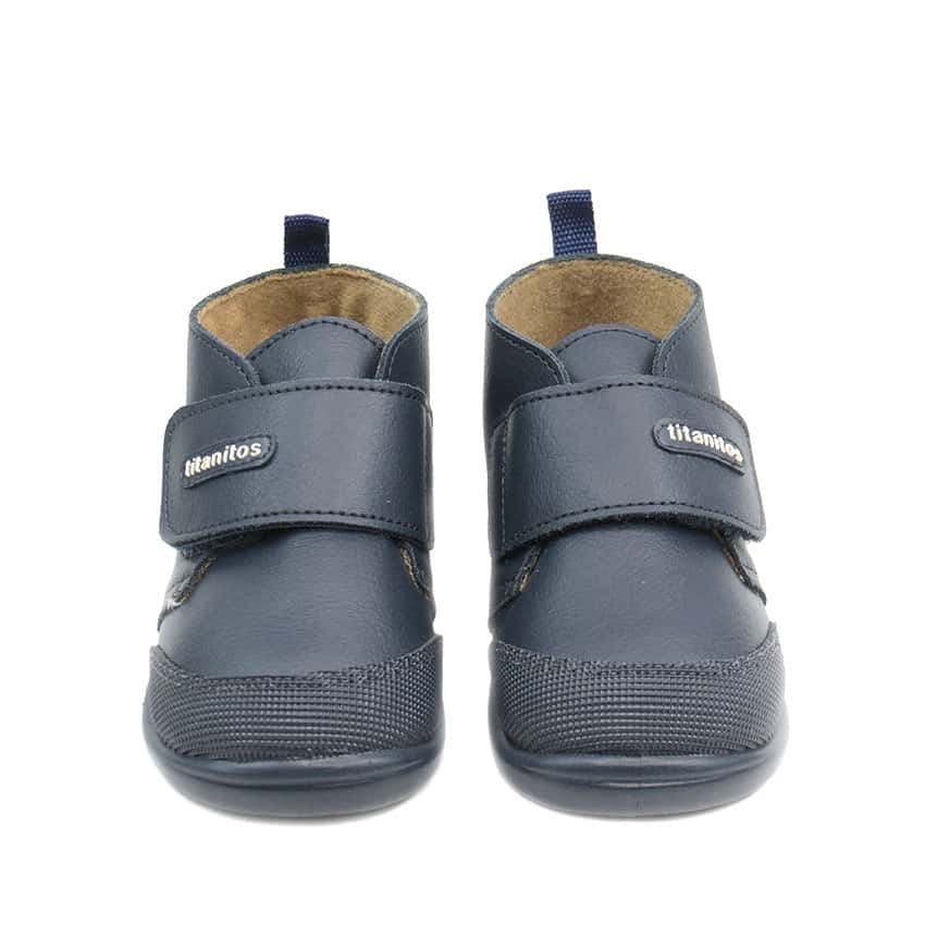 Bota para niño marca Titanitos diseñada en piel lavable color marino con punta reforzada y cierre de velcro. Bota RESPETUOSA super flexible.