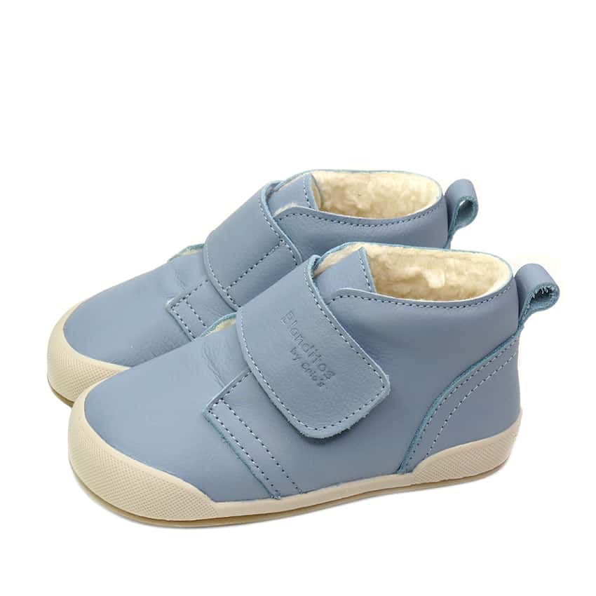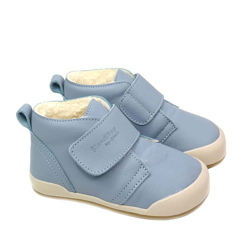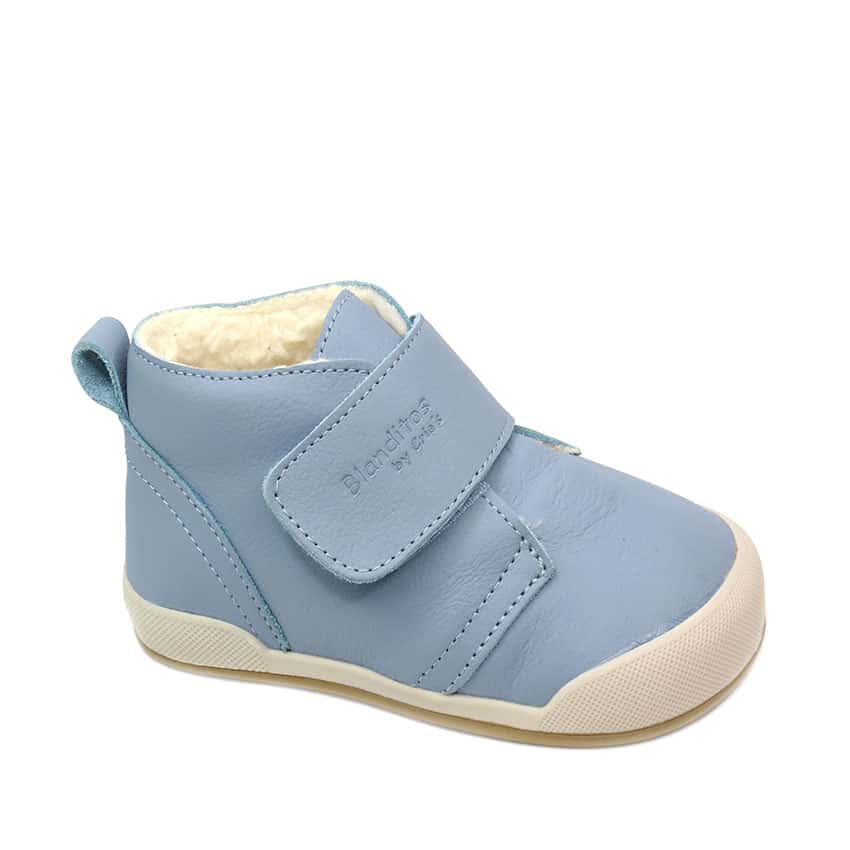 Realizada en 100% piel natural de primera calidad en color azul cielo . Un color super combinable y perfecto para vestir casual y confortable en cualquier temporada en sus primeros pasos. Con cierre velcro para un mayor calce y ajuste a la horma del pie y para facilitar la autonomía de los peques. Una bota super calentita gracias a su borreguito interior.