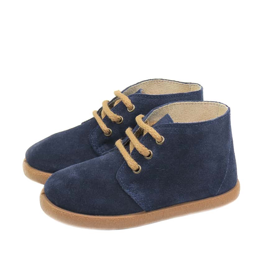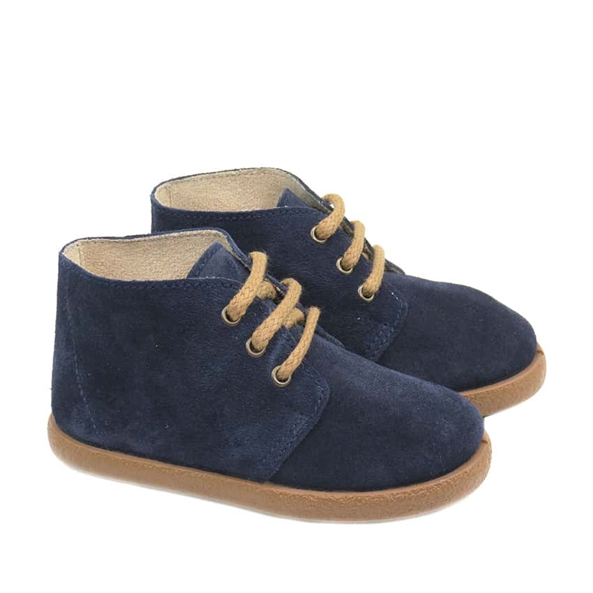 Botas de serraje super blanditas diseñadas en color marino con cordones y suela marrón. Un calzado ideal para vestir.