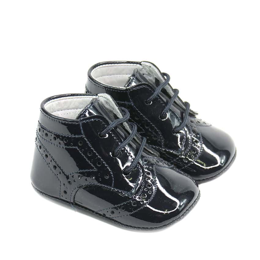 Botita para bebés recien nacidos en charol beige , camel y azul marino con picado y cordones.
