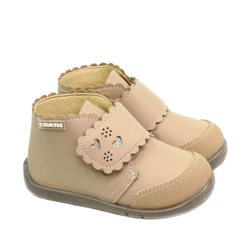 Para esta temporada te presentamos esta botita respetuosa de la marca Titanitos , fabricada en una piel suave y lavable color Arena, con refuerzo de goma en la parte delantera y con cierre de velcro para un mejor ajuste . Una bota con diseño de corazones ideal para combinarla con un estilo mas sport o más vestido. Suela ligera , plana y antideslizante . Forrada interiormente de piel y con una plantilla libre de bacterias.
