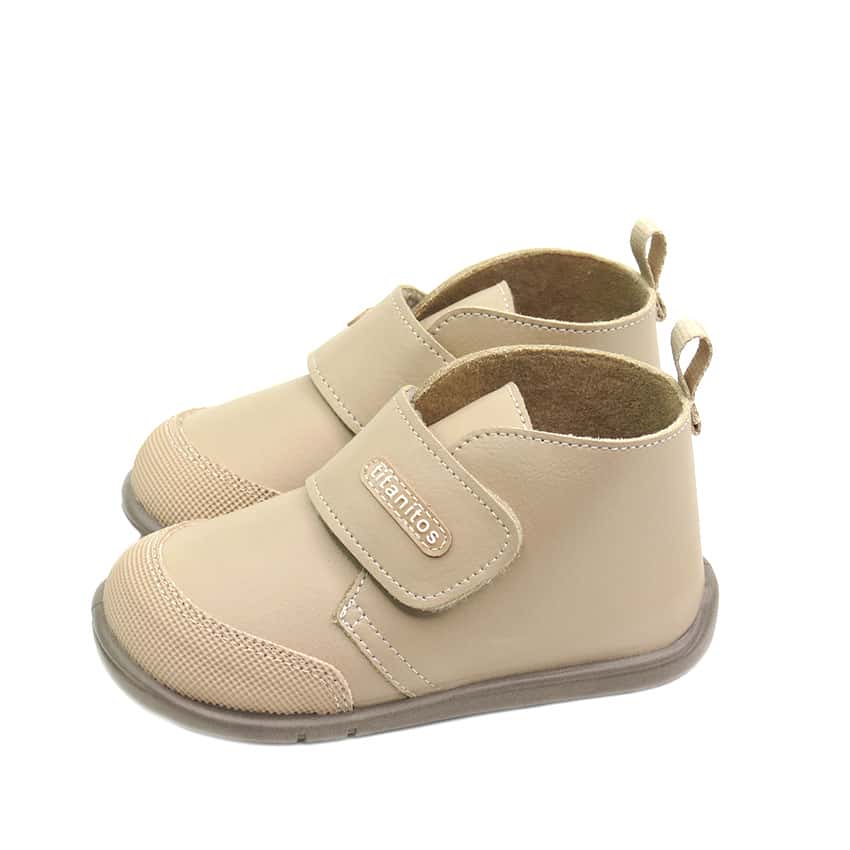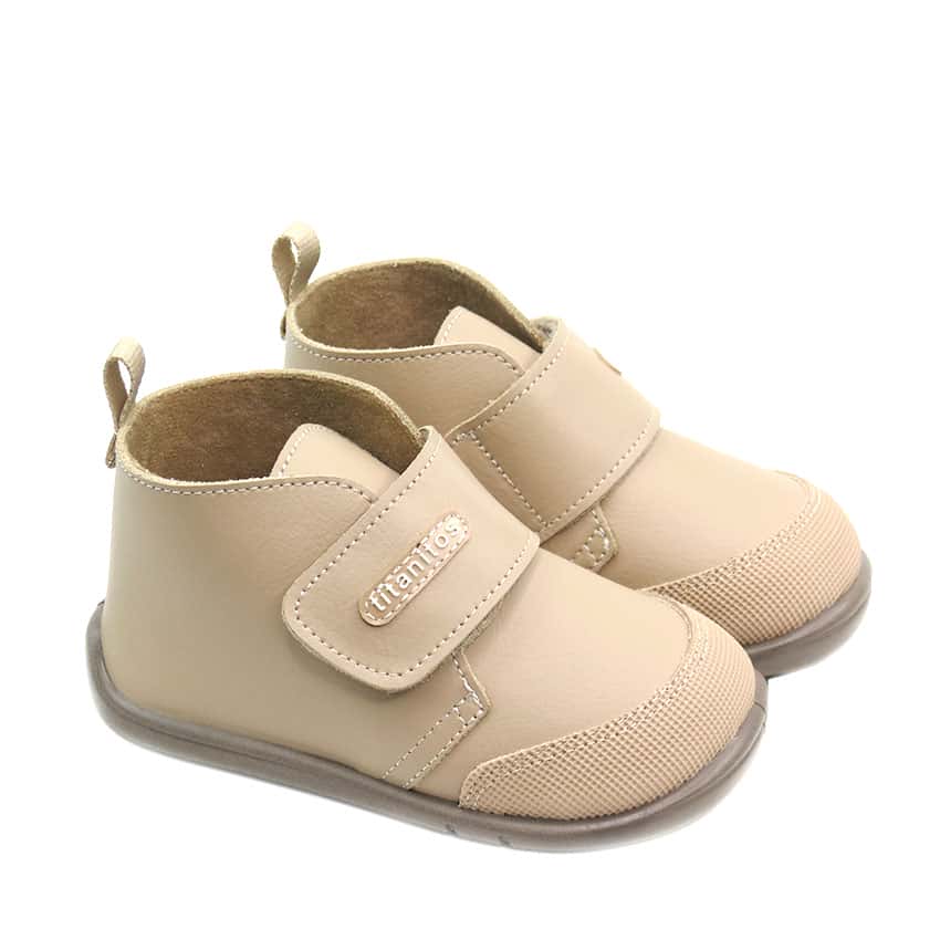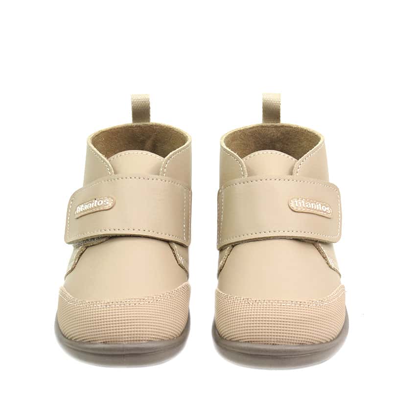 Botitas respetuosas para niños marca Titanitos diseñadas en piel lavable color camel con punta reforzada y cierre de velcro. Botas ideales para vestir en el invierno.