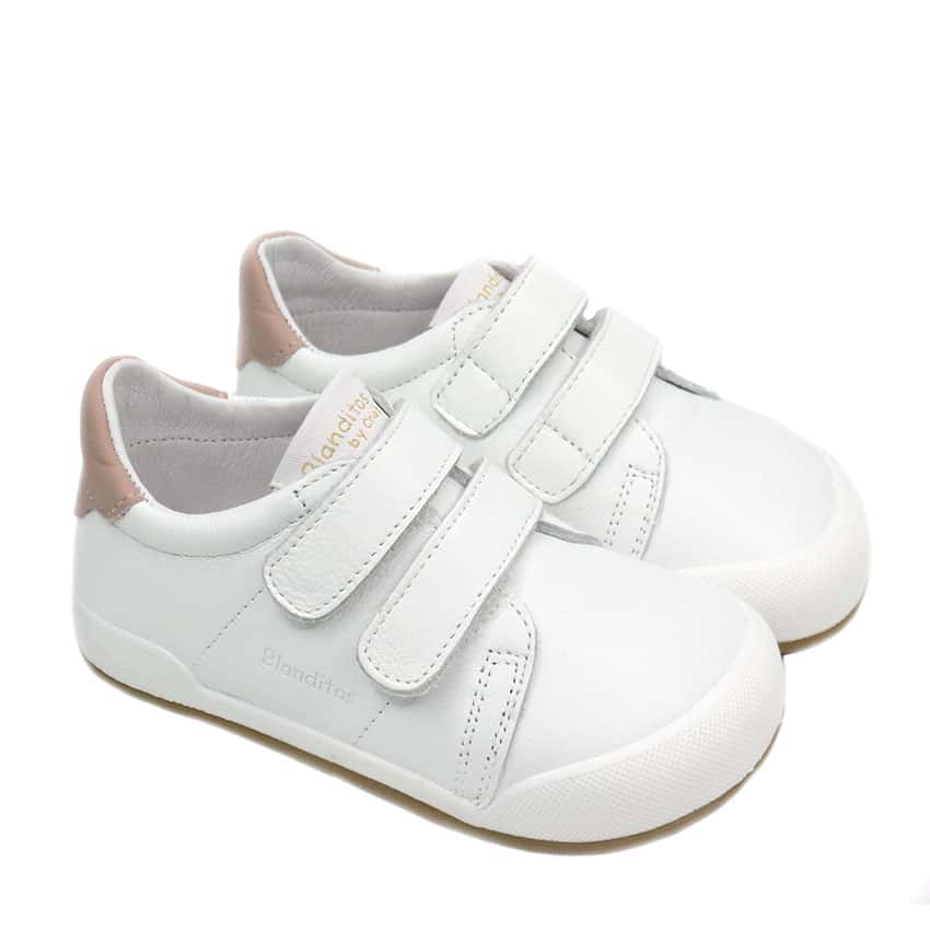 Deportiva modelo Londres de Blanditos by Crios diseñada en piel blanca con talonera rosa.
