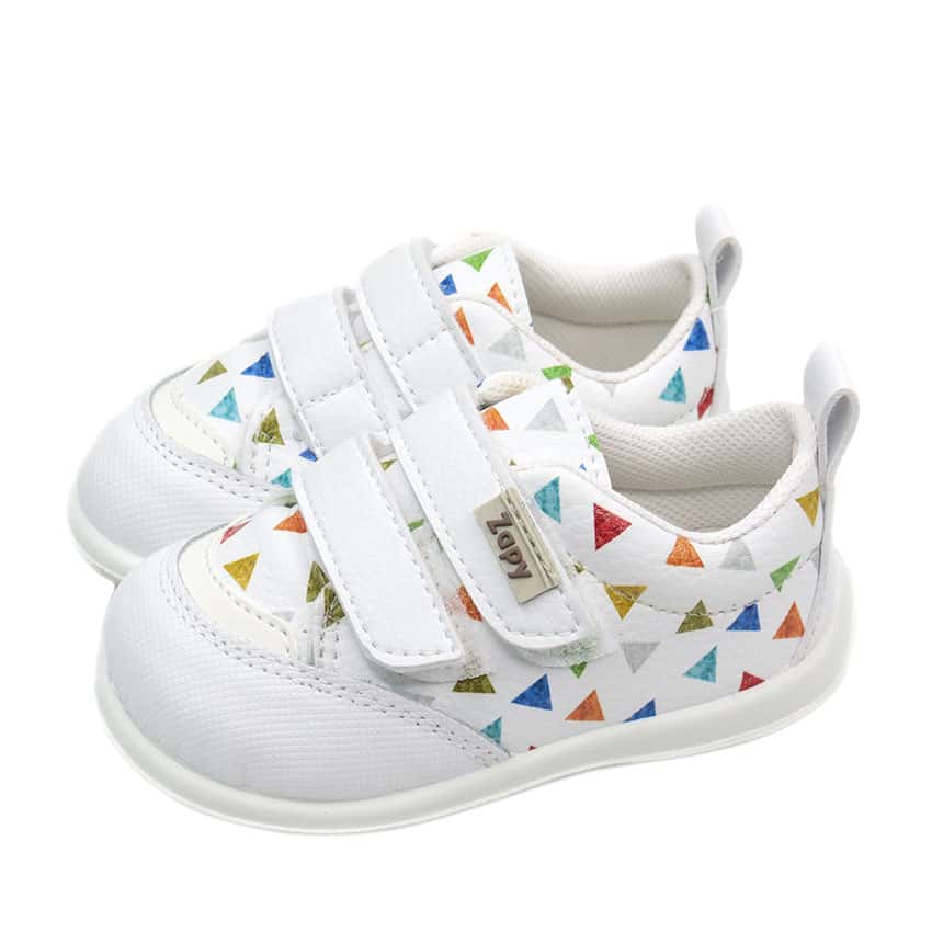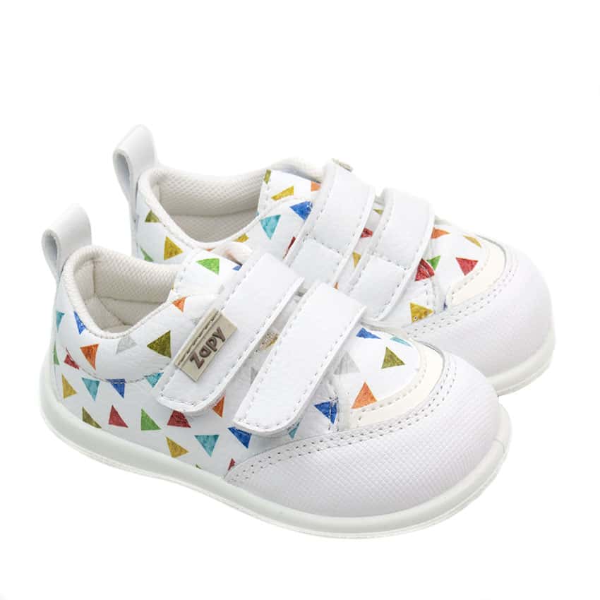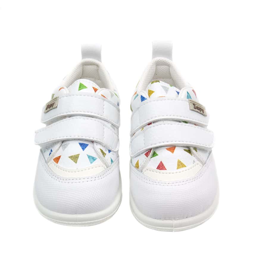 Deportiva respetuosa marca Zapy en color blanco con diseño en triangulos de colores. Horma pie estrecho. Pedir 1 talla más.