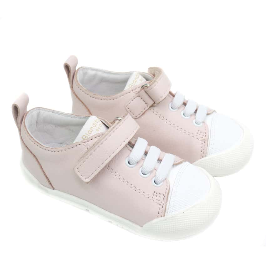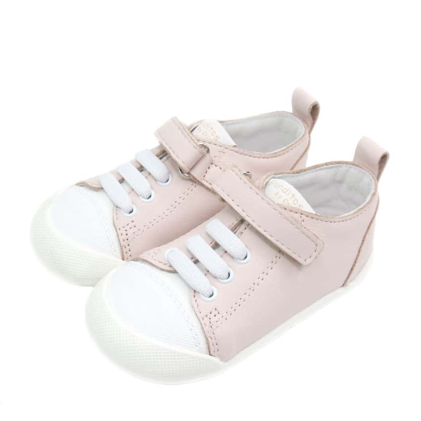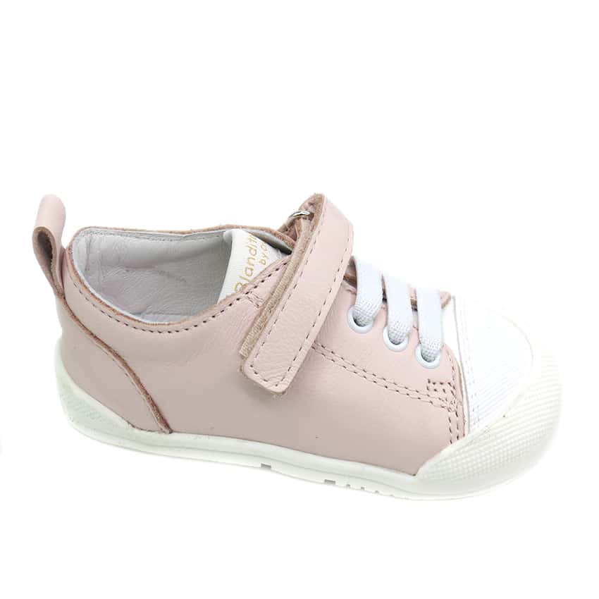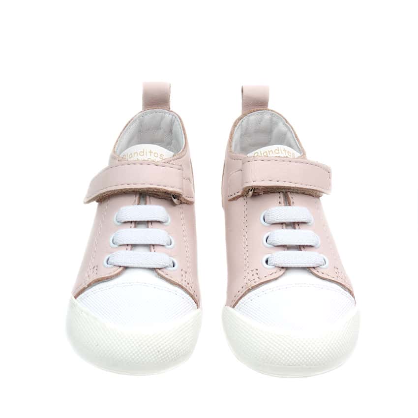 Deportiva respetuosa modelo Ariel de Crios Blanditos. Diseñada en piel rosa con suela y cordones blancos. Cierre velcro.