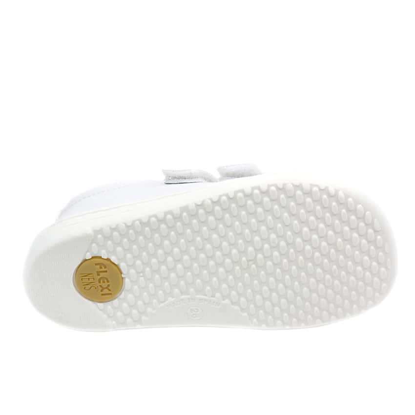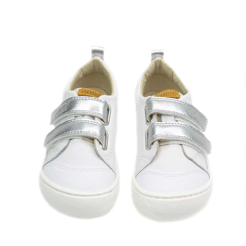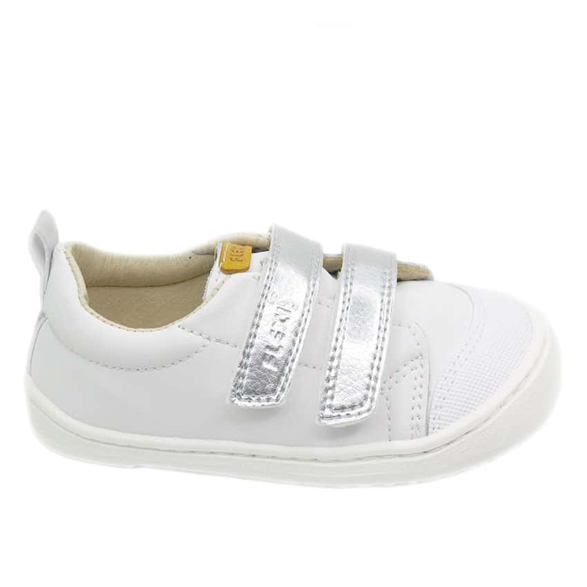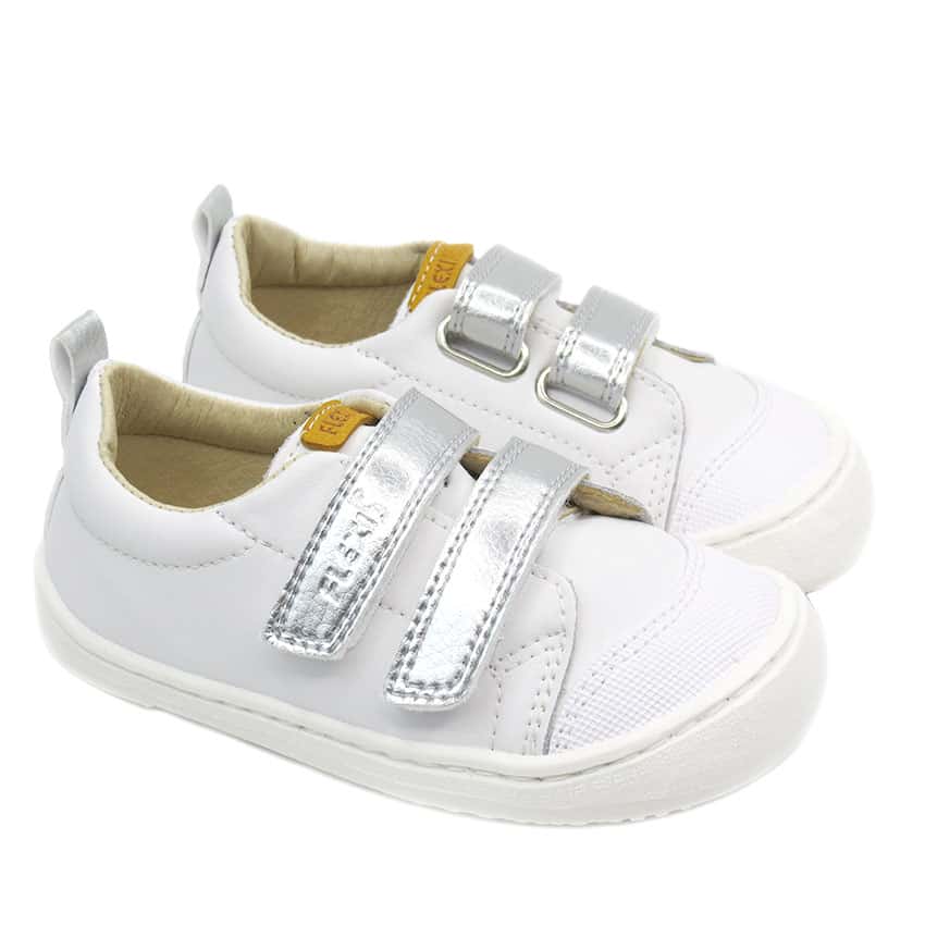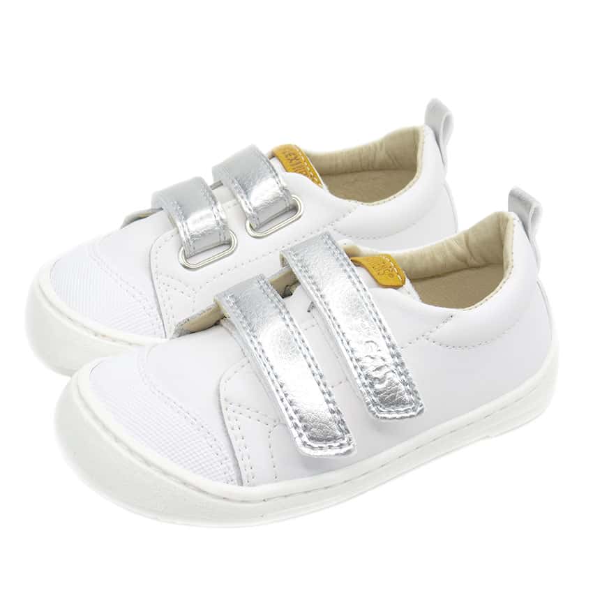 Deportivas respetuosas marca Nens diseñadas en piel blanca con velcros color plata.