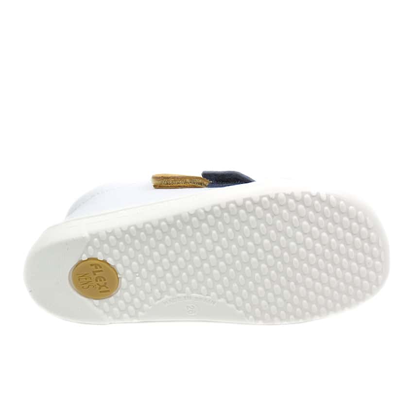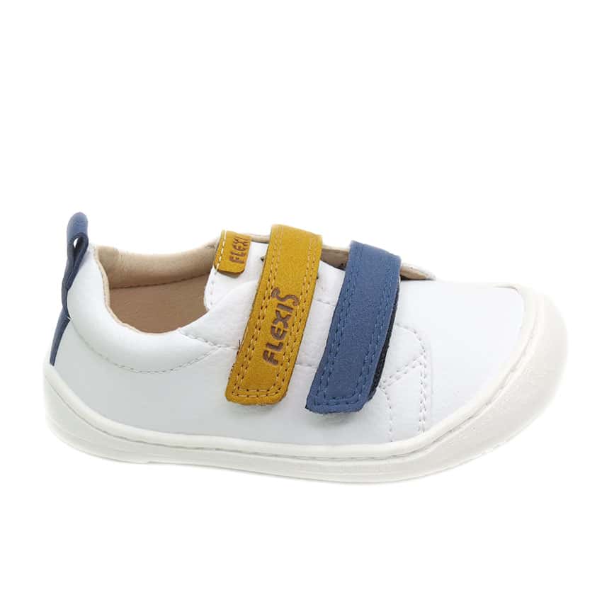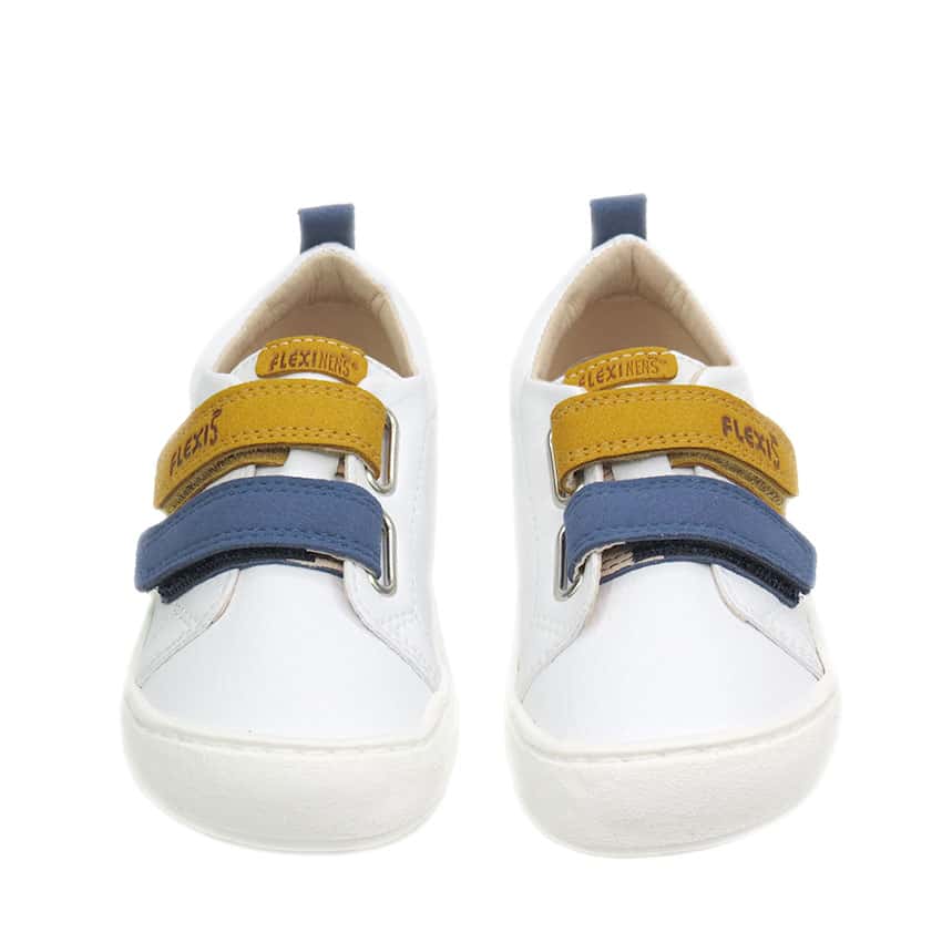 Deportivas respetuosas marca Flexinens diseñada en piel blanca con velcros azul y mostaza.