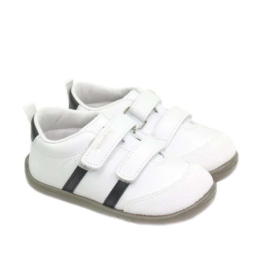 Deportivas respetuosas marca Titanitos modelo Mauro diseñada en piel lavable blanca con tiras negras y doble velcro.