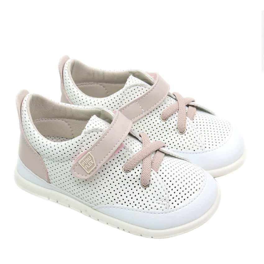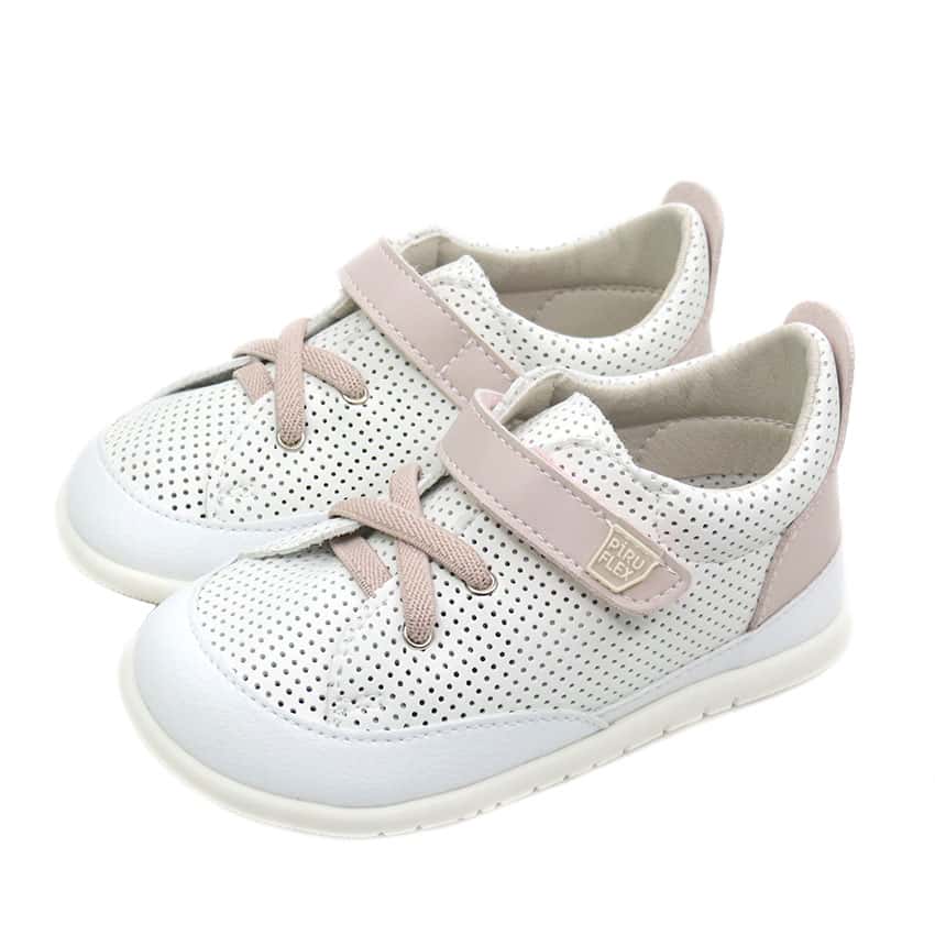 Deportivas respetuosas marca Piruflex diseñadas en color blanco con rosa .
