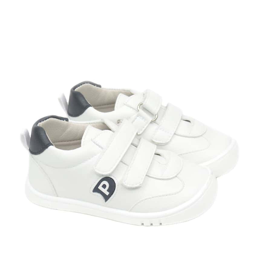 Deportiva barefoot marca Piruflex diseñada en microfibra blanca con marino . Calzado vuelta al cole.