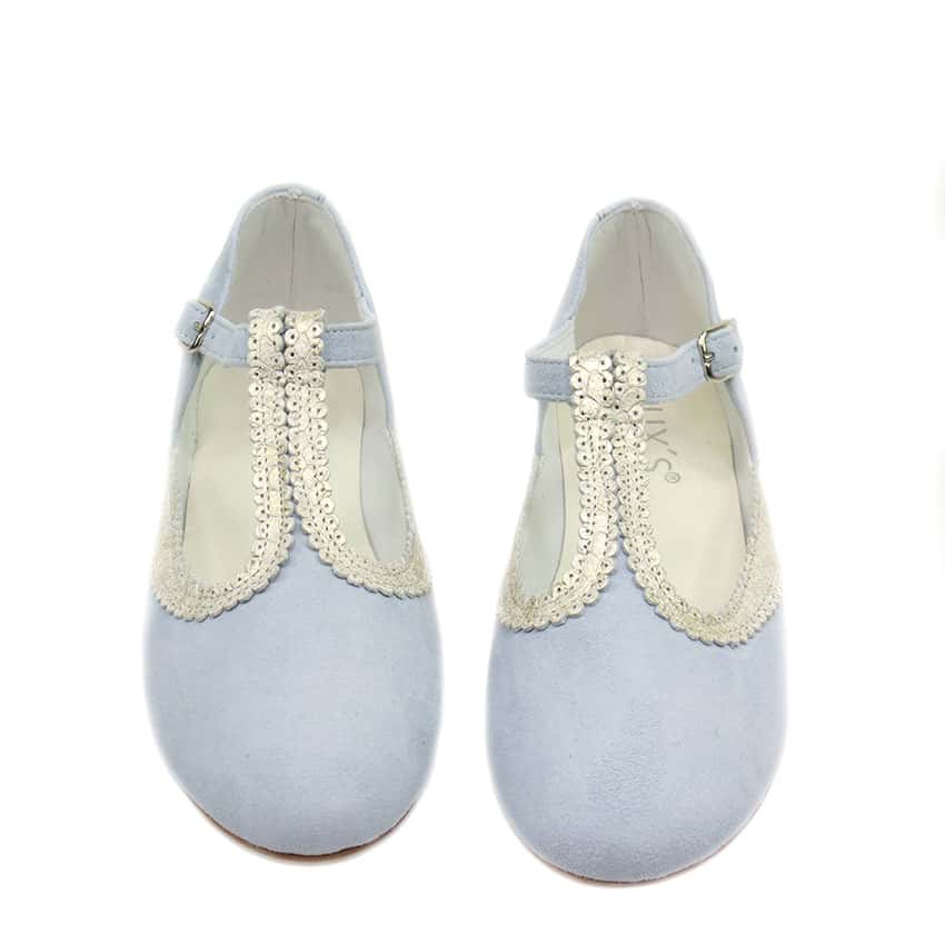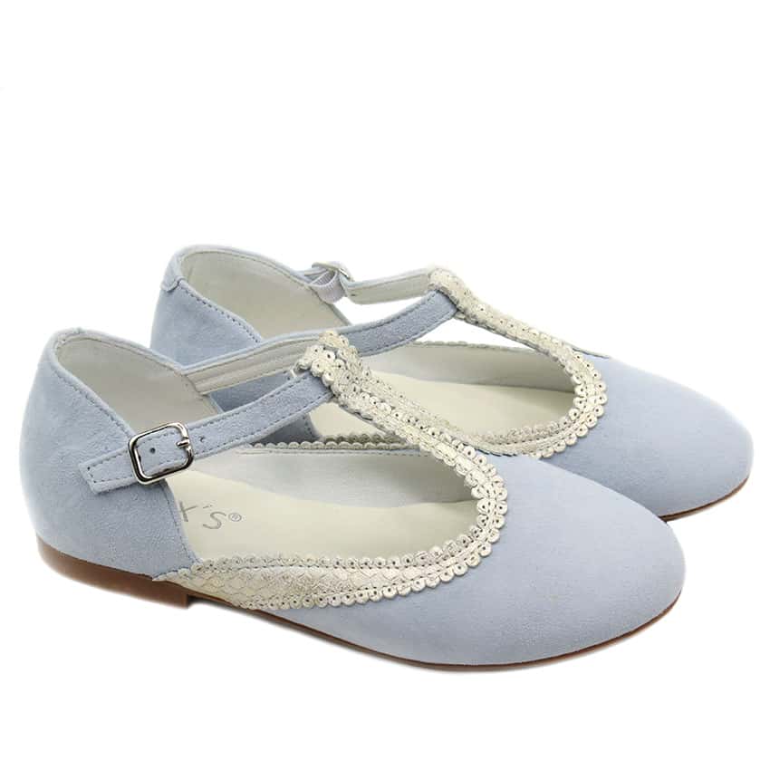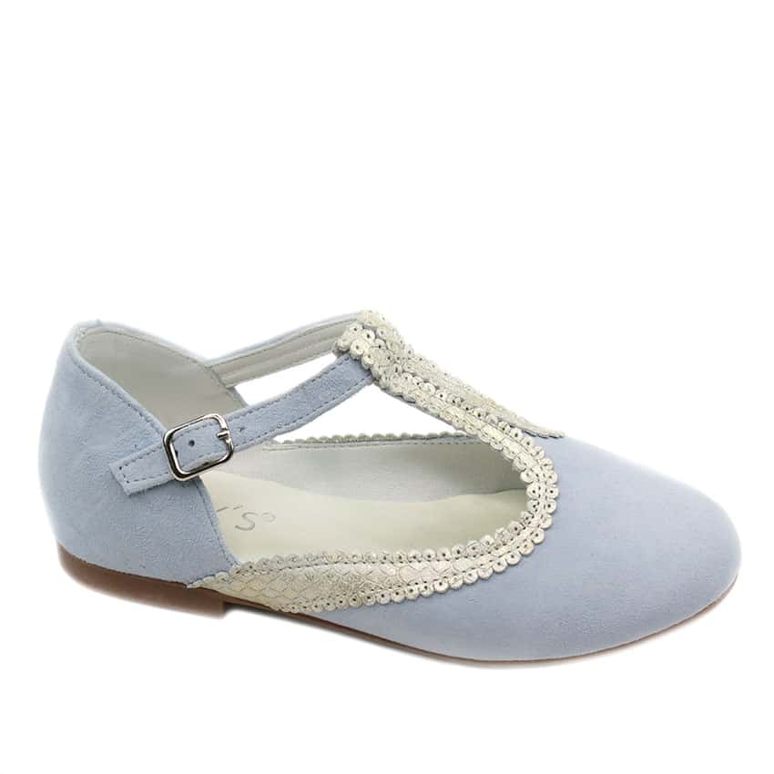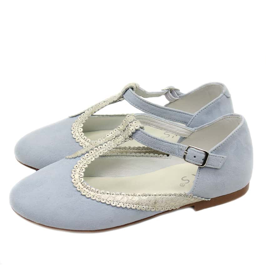 Preciosa mercedita de Primera Comunión para niña en color azul empolvado. Un calzado muy elegante para ese dia tan especial.