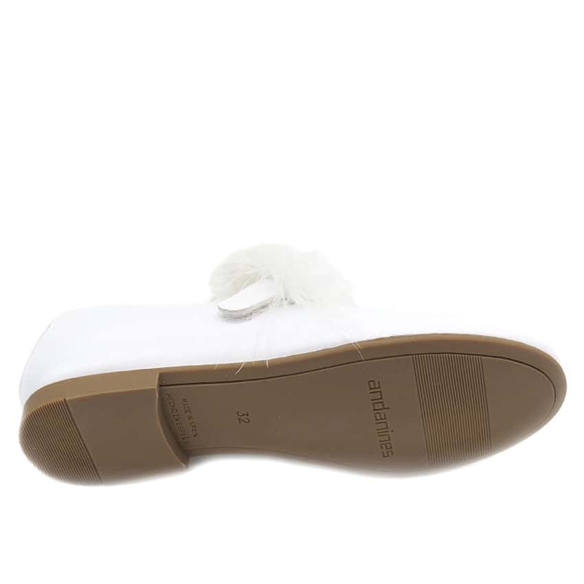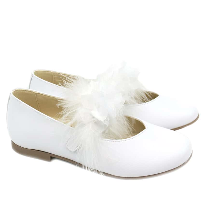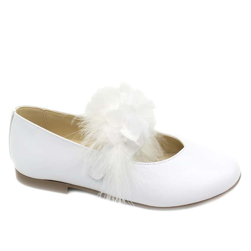 Mercedita Niña en piel blanca con cierre de velcro y detalla en flores de quita y pon. Fabricadas en España por Andanines.