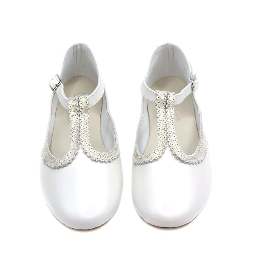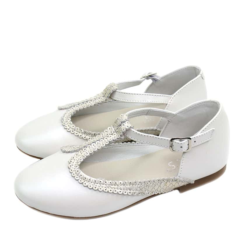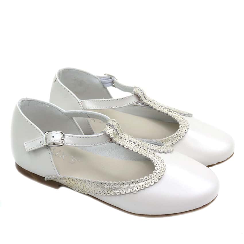 Elegante Mercedita de niña de Comunión diseñada en color blanco nacarado con ribete en color plata . Fabricadas por la marca Gux´s Shoes.