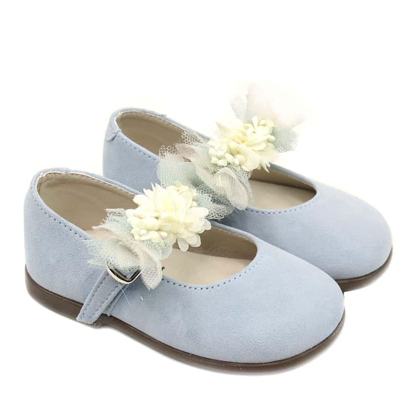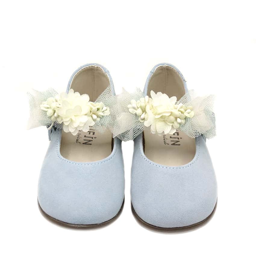 Mercedita de niña en ante color azul empolvado con flores de quita y pon. Fabricación 100 % española por pirufin.
