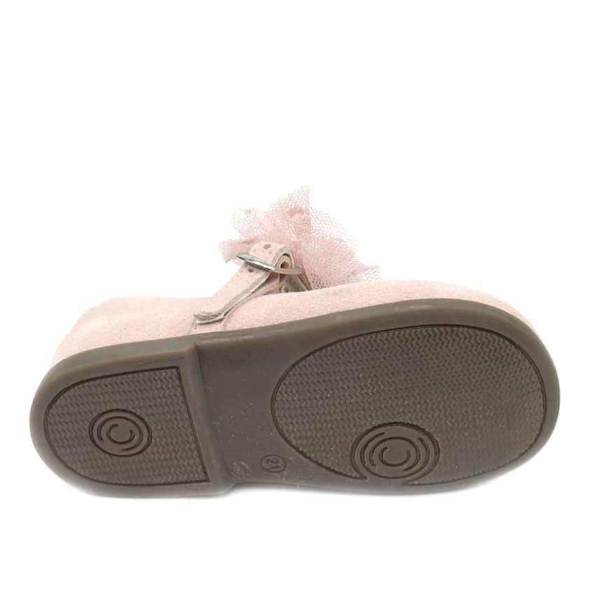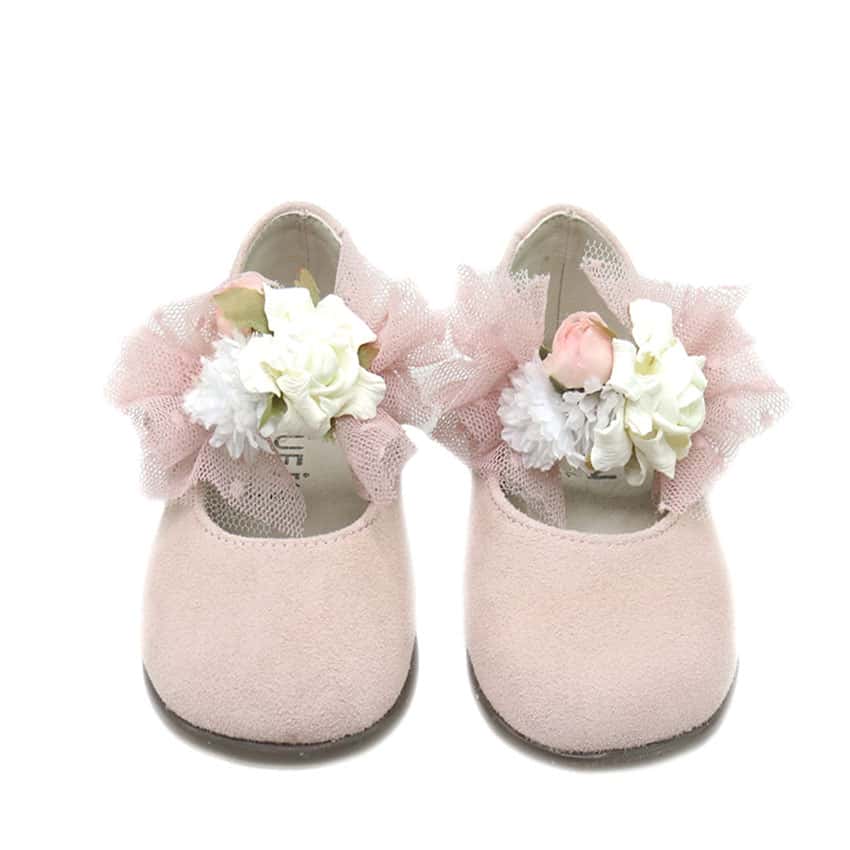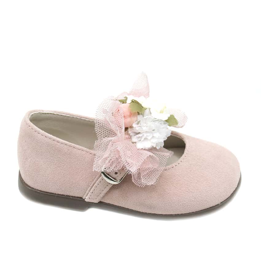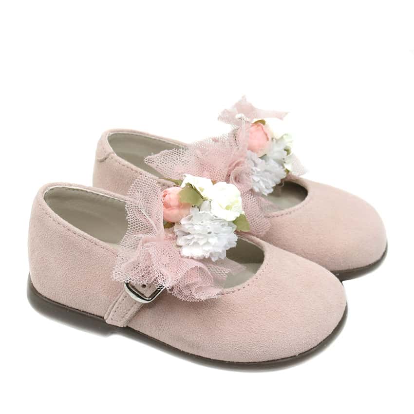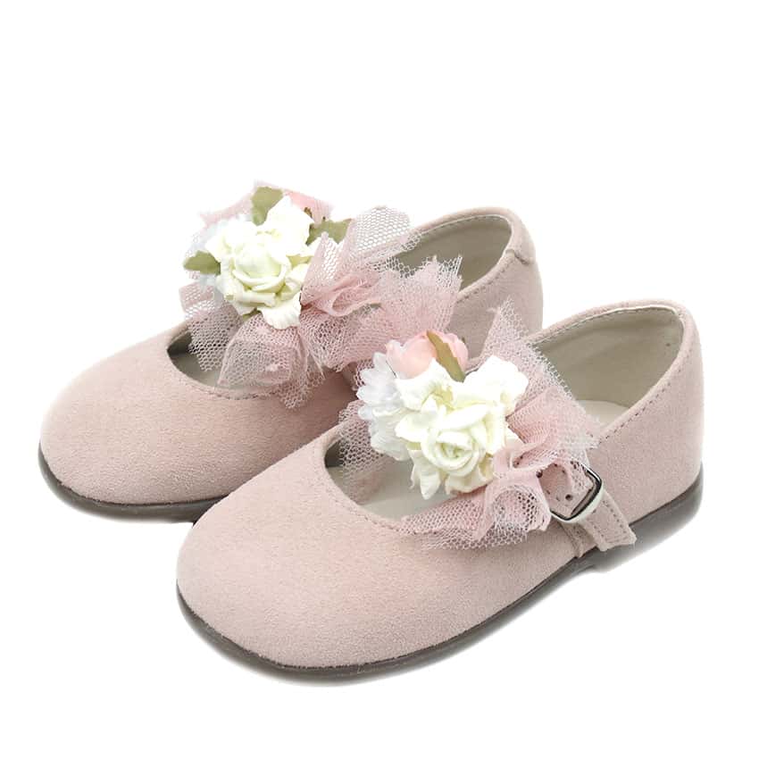 Mercedita para niña elegante y de vestir diseñada en ante rosa empolvado con detalle de flores de quita y pon de la marca Piruflex.