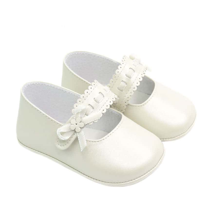 Mercedita de niña para bautizo diseñada en piel nacarada beige con adorno de lazo y cierre con velcro.