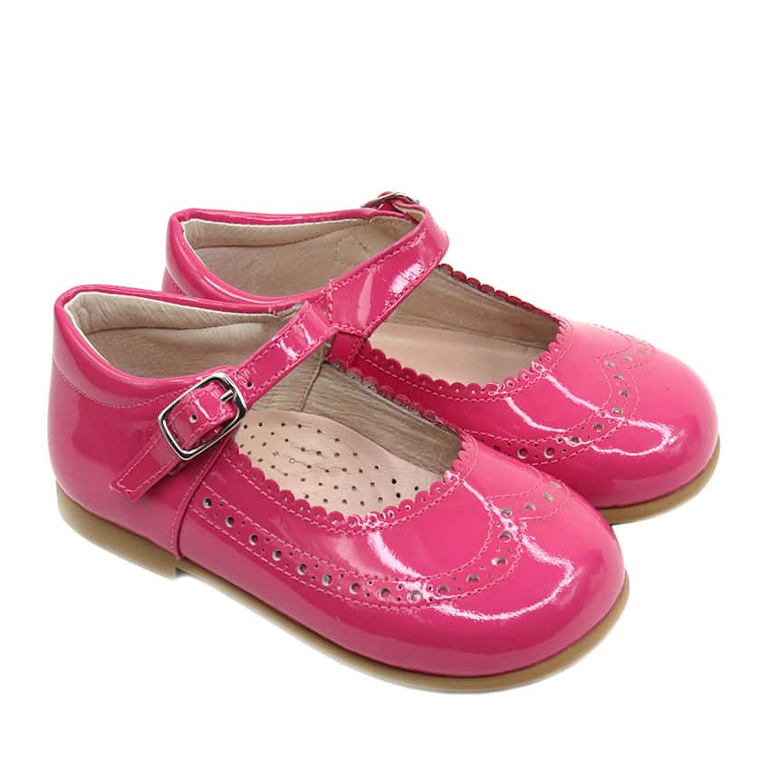 Merceditas de niña en charol con picado color fucsia.
