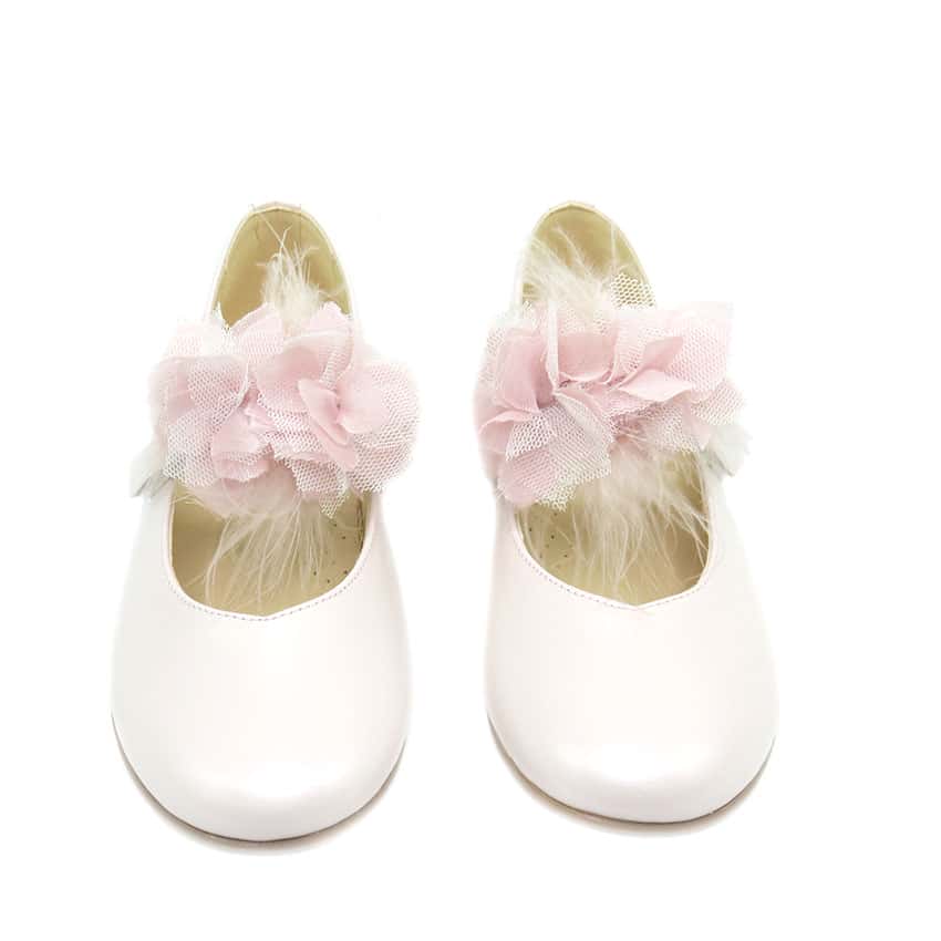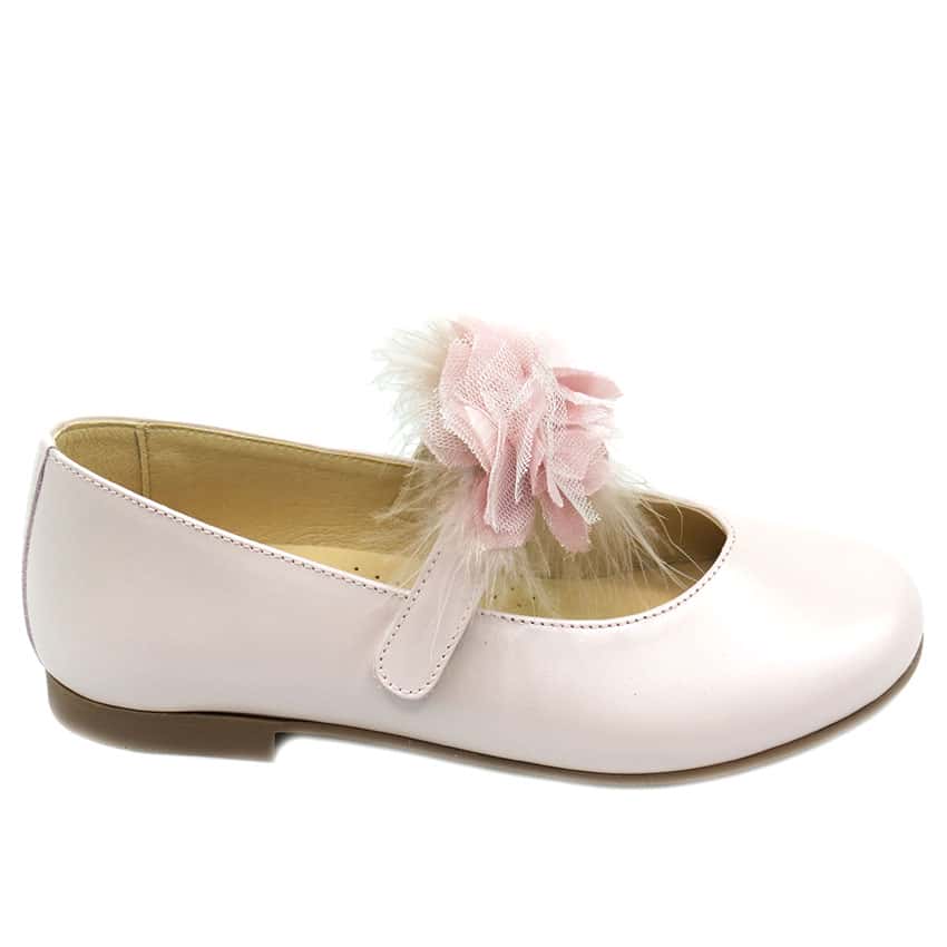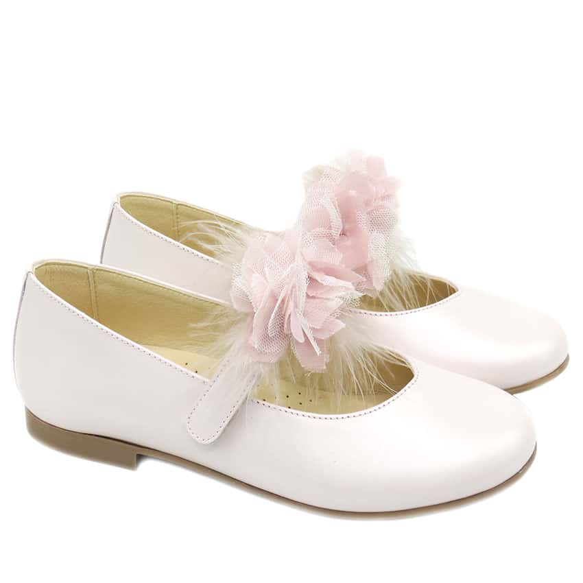 Mercedita de niña Primera Comunión marca Andanines en piel rosa con adorno de pluma de quita y pon y cierre de velcro.