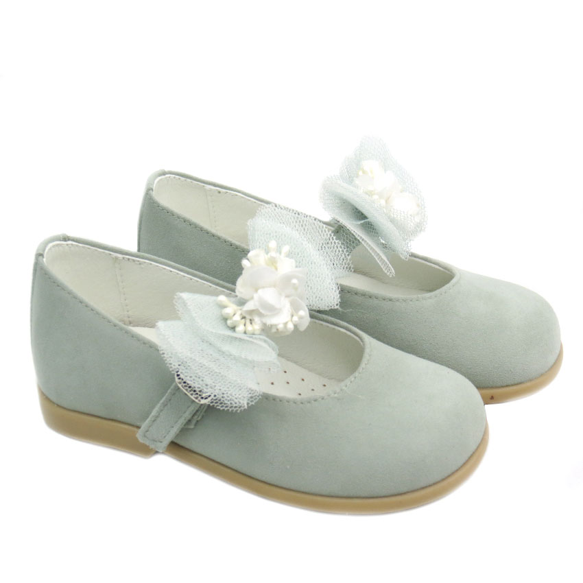 Zapato tipo mercedita en ante verde salvia con adorno de quita y pon marca Andanines. Zapato de vestir ideal para arras y eventos.