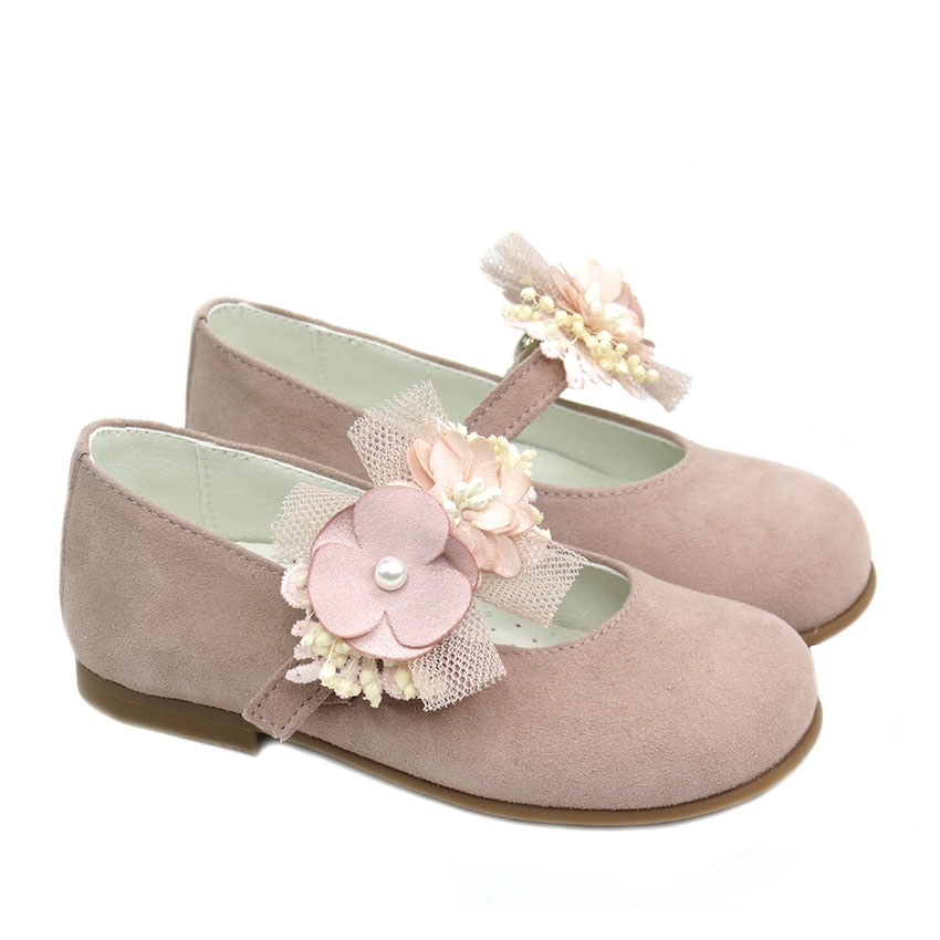 Mercedita para niña en rosa empolvado con adornos de flores de quita y pon marca Andanines.