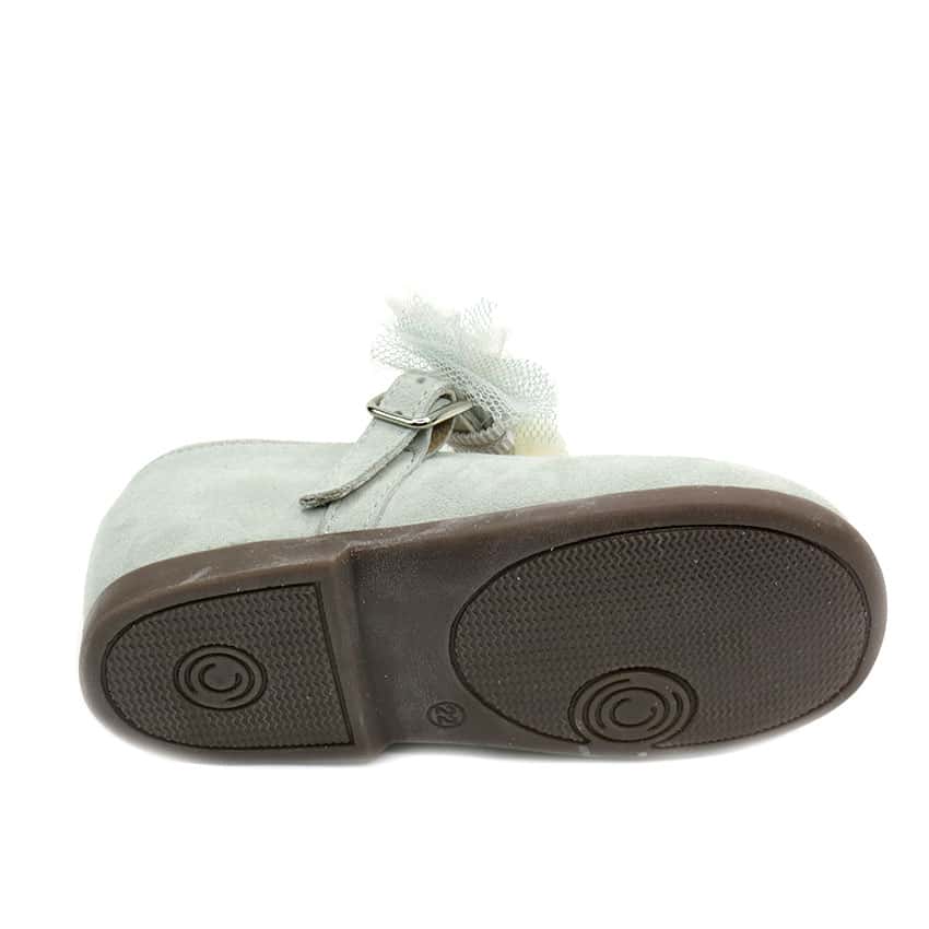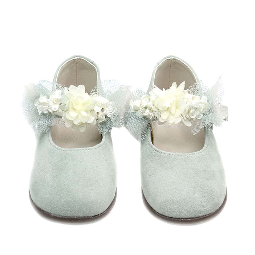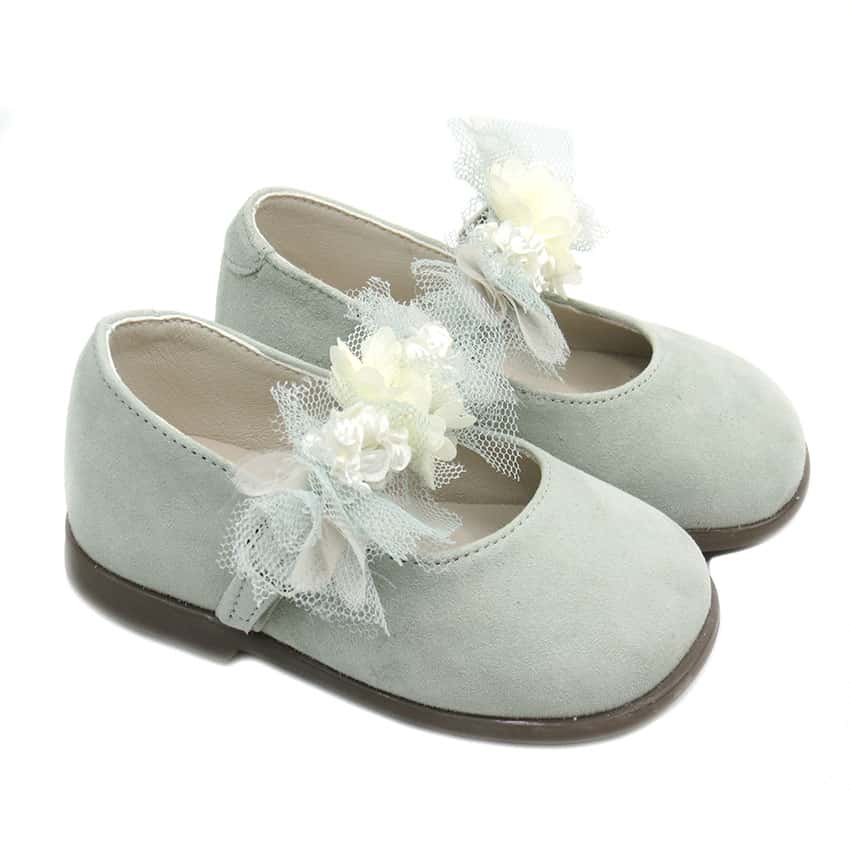 Mercedita de niña en ante color verde salvia con detalle de flores de quita y pon.
