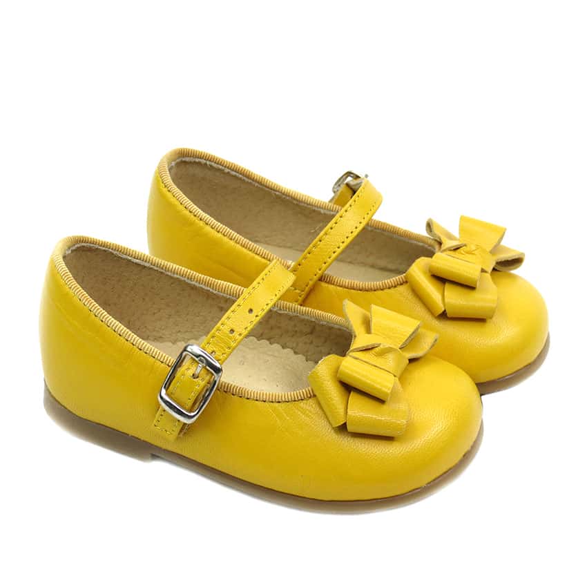 Merceditas de vestir para niñas en piel amarillo con lazo y cierre de hebilla..