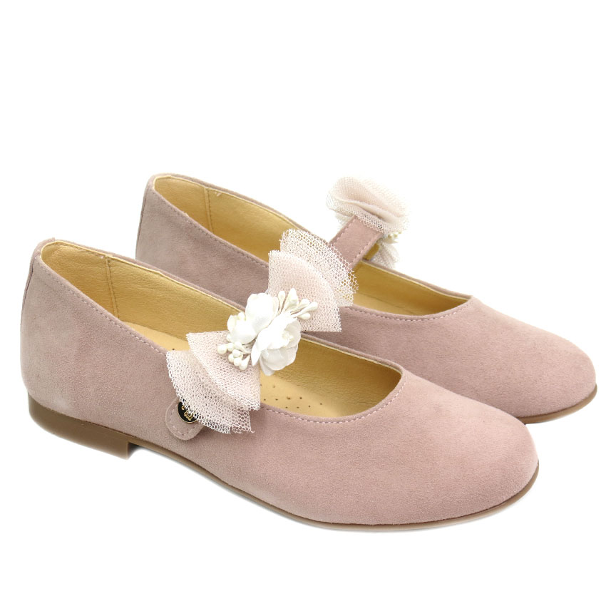 Zapato rosa empolvado par niña de vestir ideal para comuniones y bodas con adorno de quita y pon. Fabricado en España por Andanines.