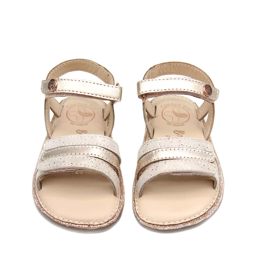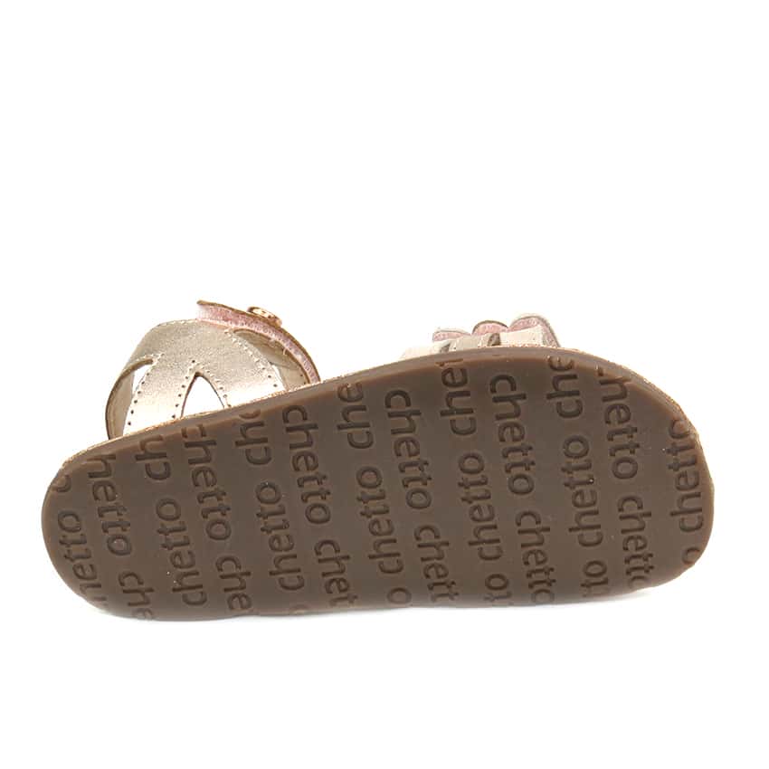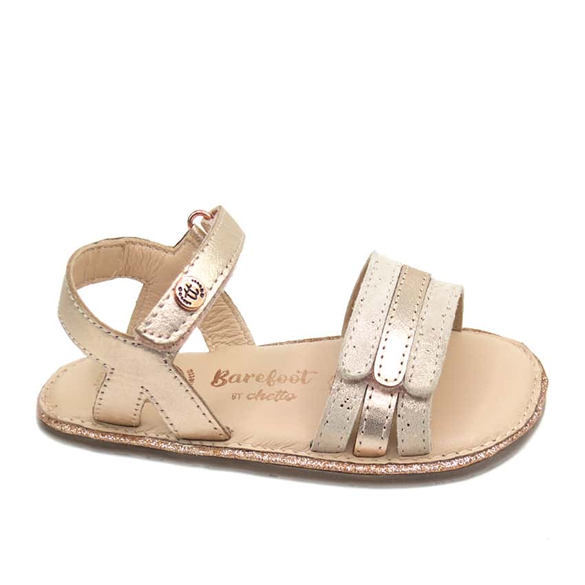 Sandalia respetuosa marca Chetto diseñada en tonos rosas metalizados con velcros ajustables.