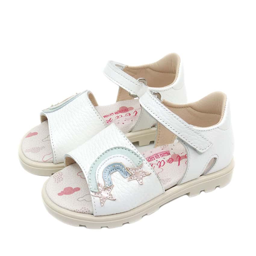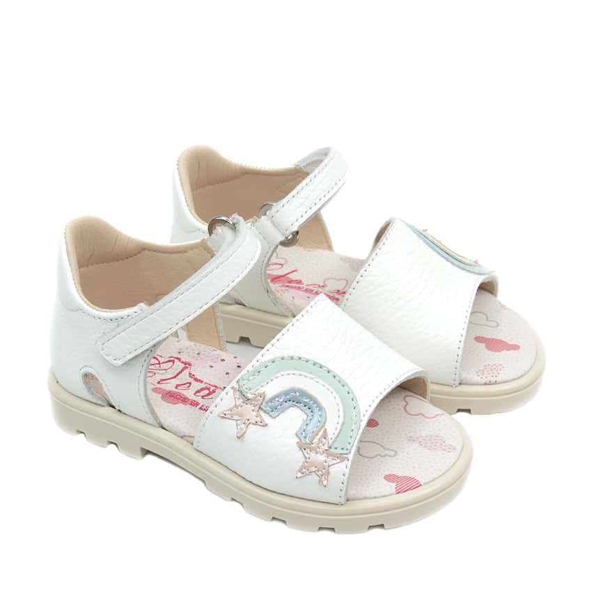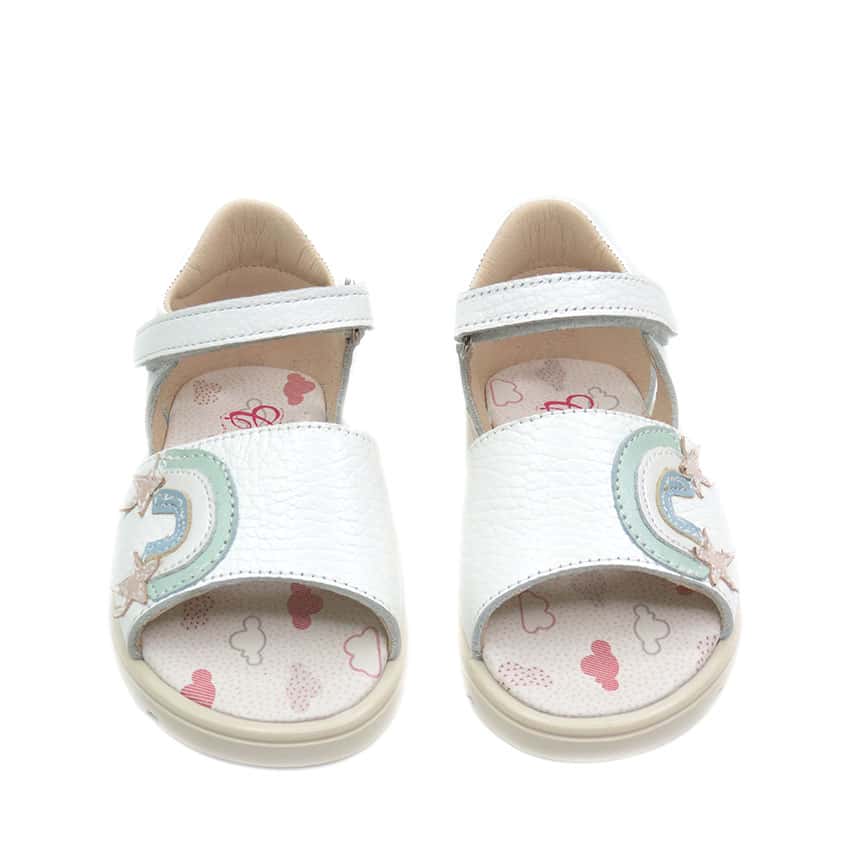 Sandalias de niñas en piel blanco con diseño arcoiris y cierre de velcro. Fabricacion 100 % española by Yowas.
