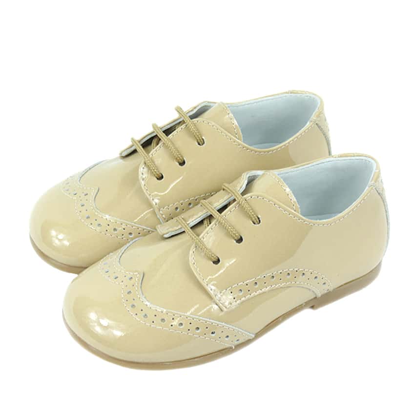 Zapato blucher charol con picado color camel. Fabricación 100 % español a cargo de Tinni Shoes.
