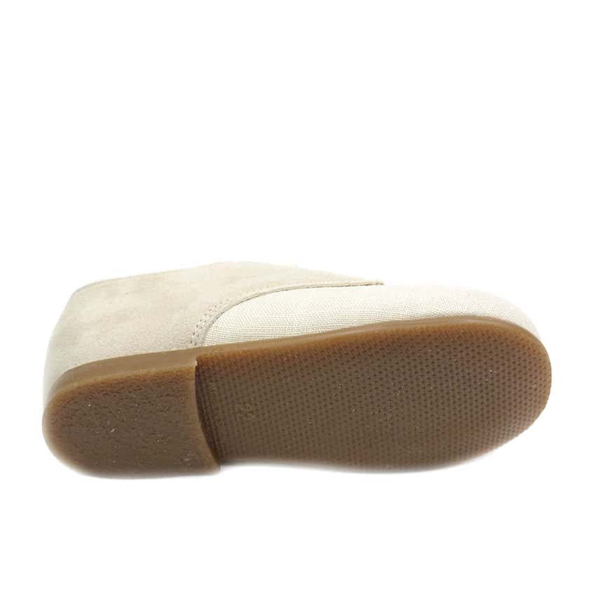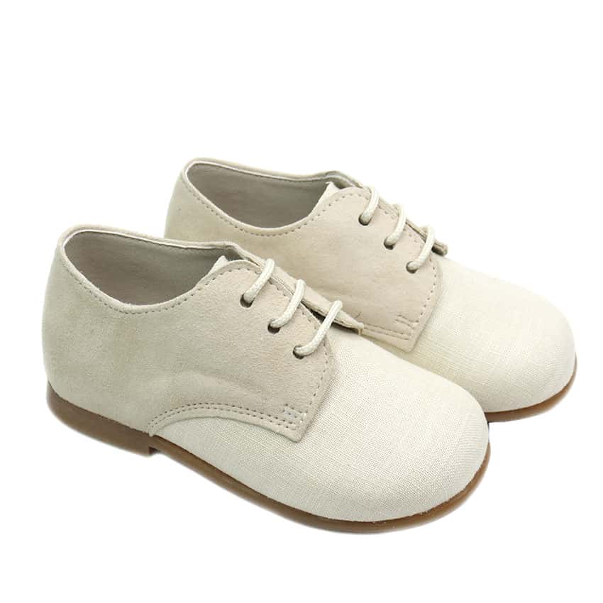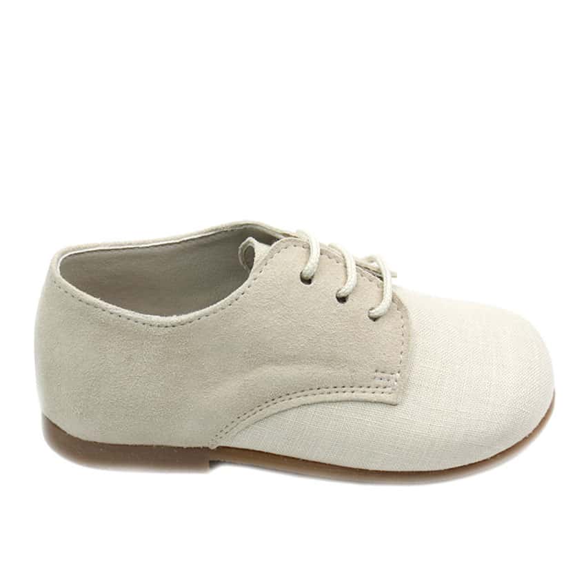 Blucher para niño diseñado en lino y ante color beige, Un calzado elegante ideal para bautizos y comuniones.