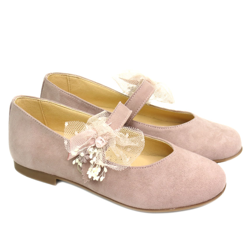 Zapato primera comunión de niña en rosa tipo mercedita con adorno en flor de quita y pon. Calzado super elegante y cómodo para ese dia tan especial.
