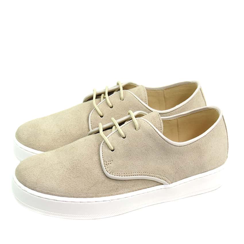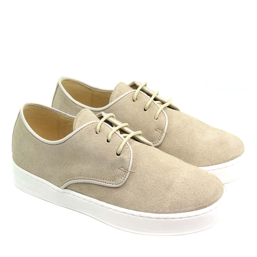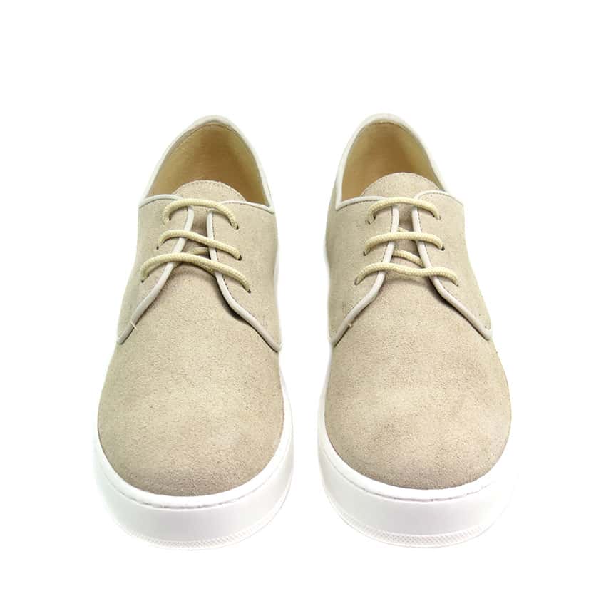 Zapato deportivo para niño ideal para vestir en eventos como Comuniones y bodas. Fabricado en España en serraje beige-taupe.