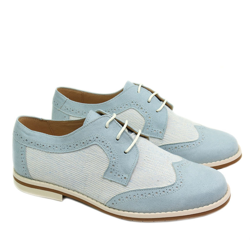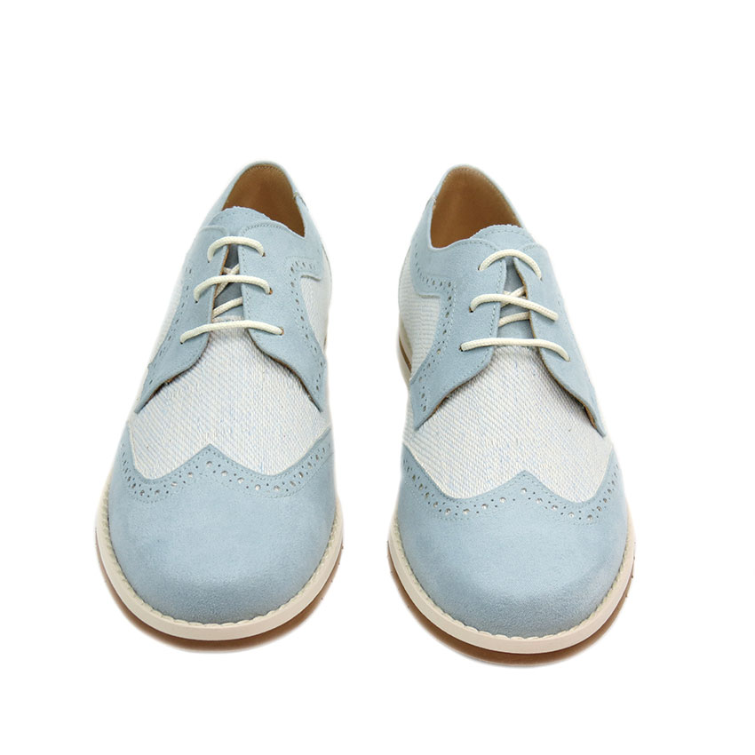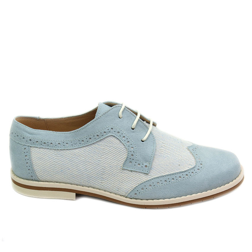 Precioso zapato de niño estilo blucher para Comuniones diseñado en gamas de azules por Maria Catalán.