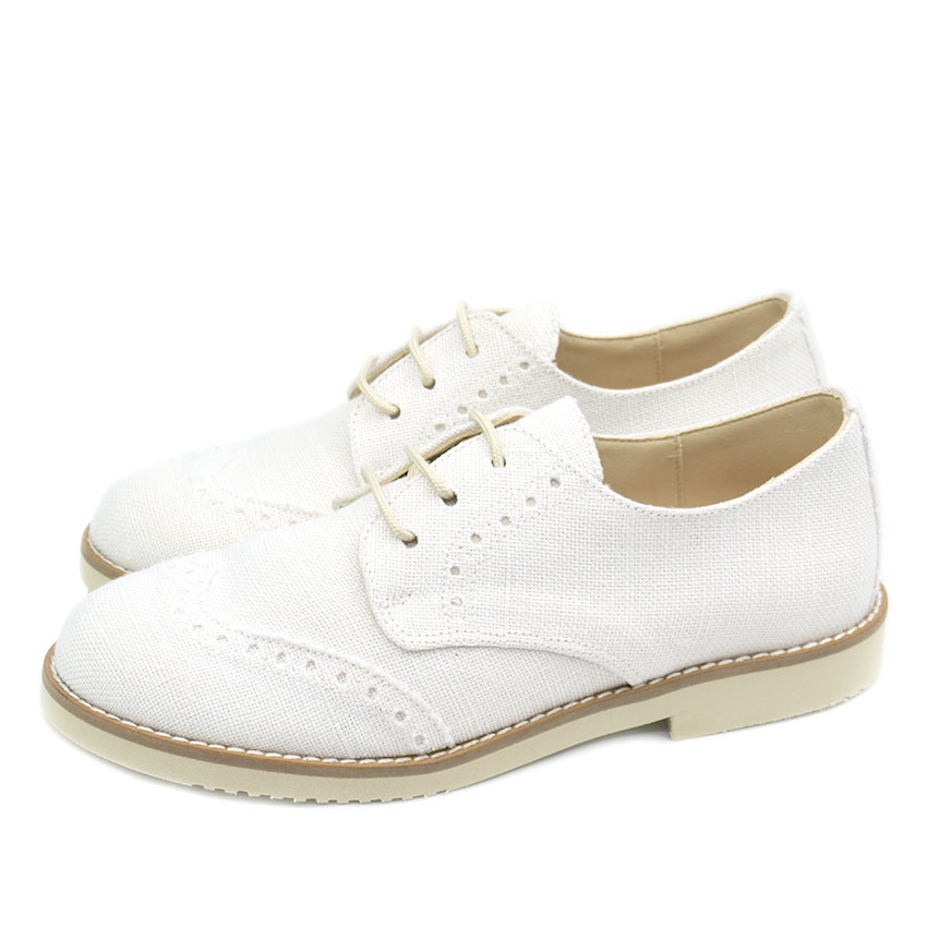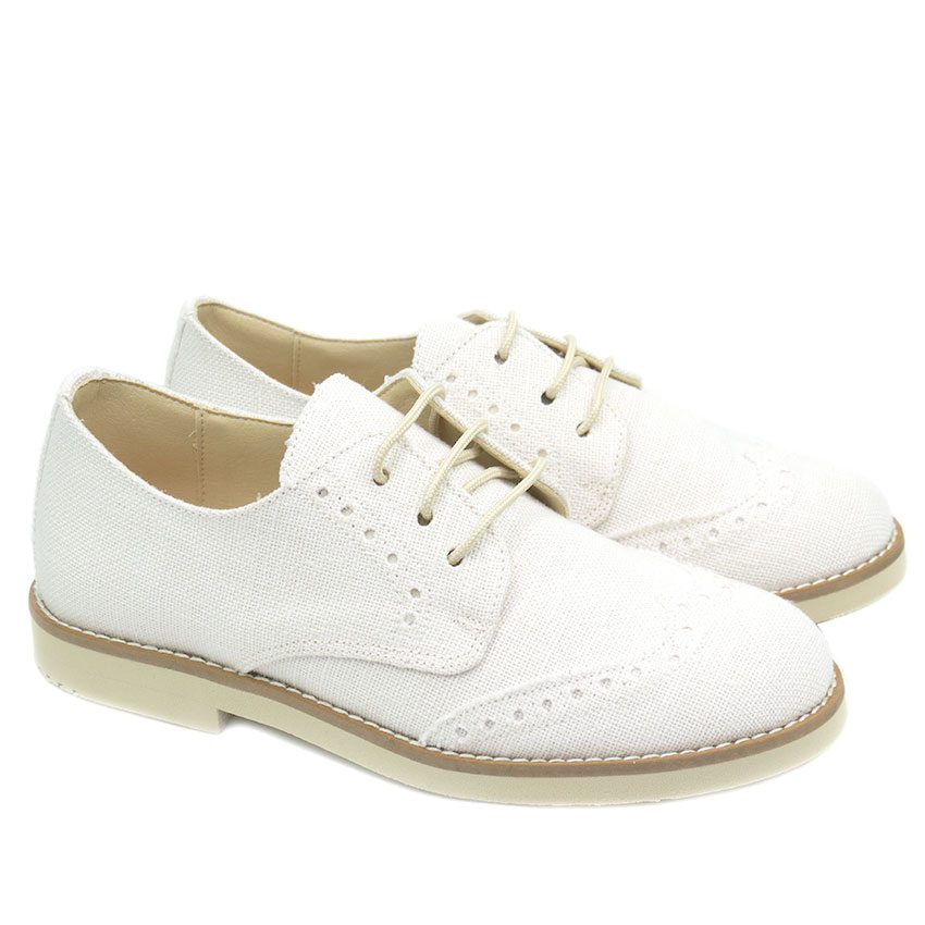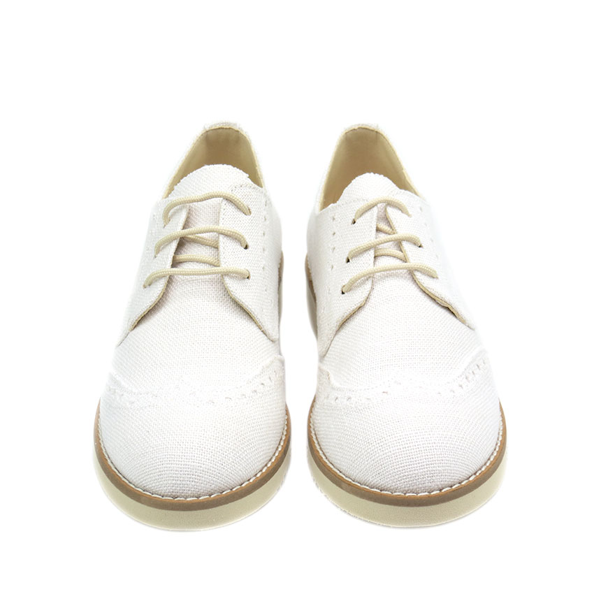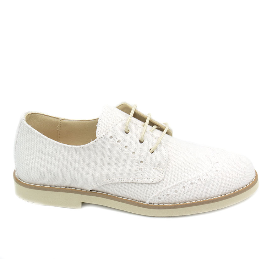 Zapato de niño en lino blanco con picado ideal para eventos como Comuniones y bodas.