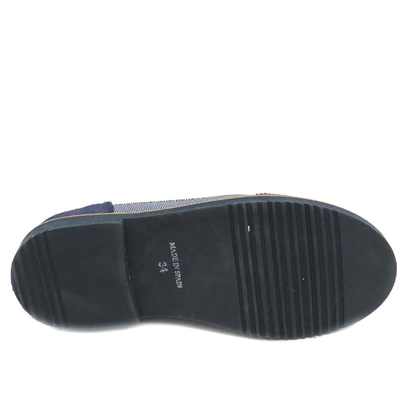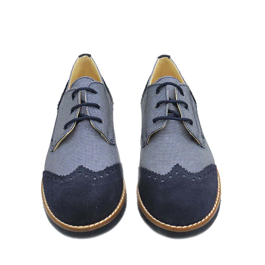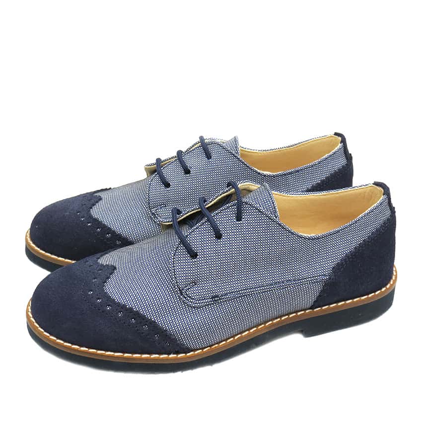 Zapato blucher niño Comunión combinado en ante marino con picado y tejido vaquero. Un zapato muy cómodo y elegante para ese dia especial.