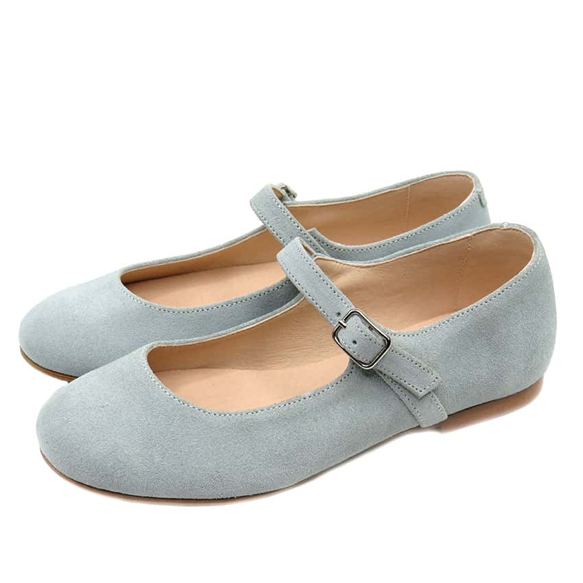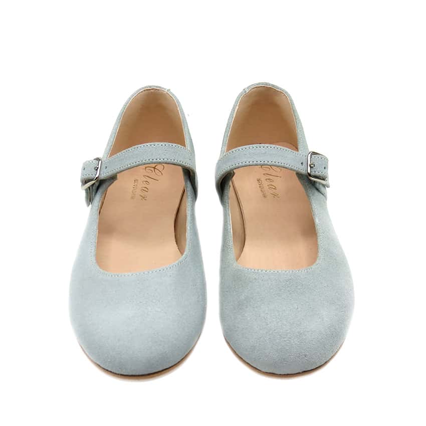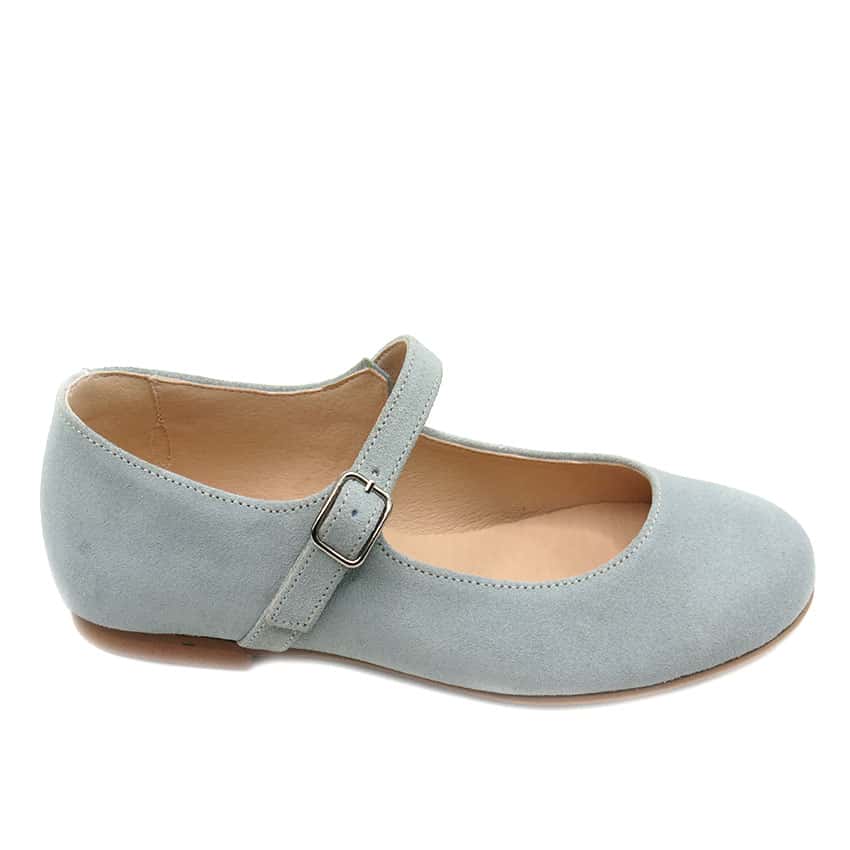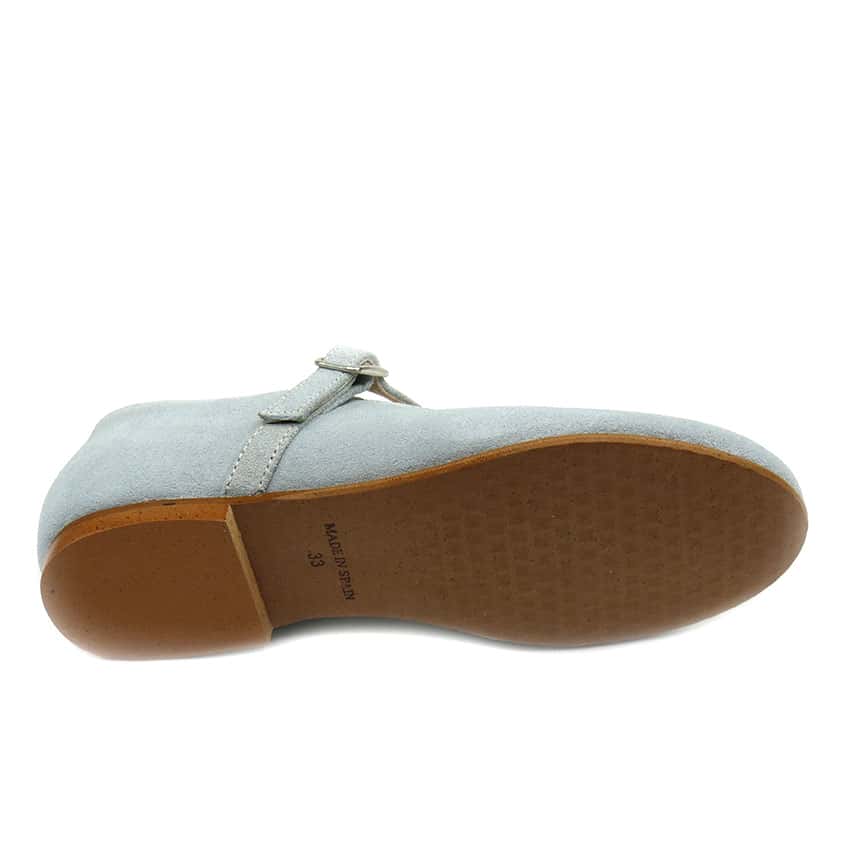 Zapato tipo mercedita para niña de Comunión en serraje verde con cierre de hebilla. Un calzado de niña de comunión sencillo y elegante.
